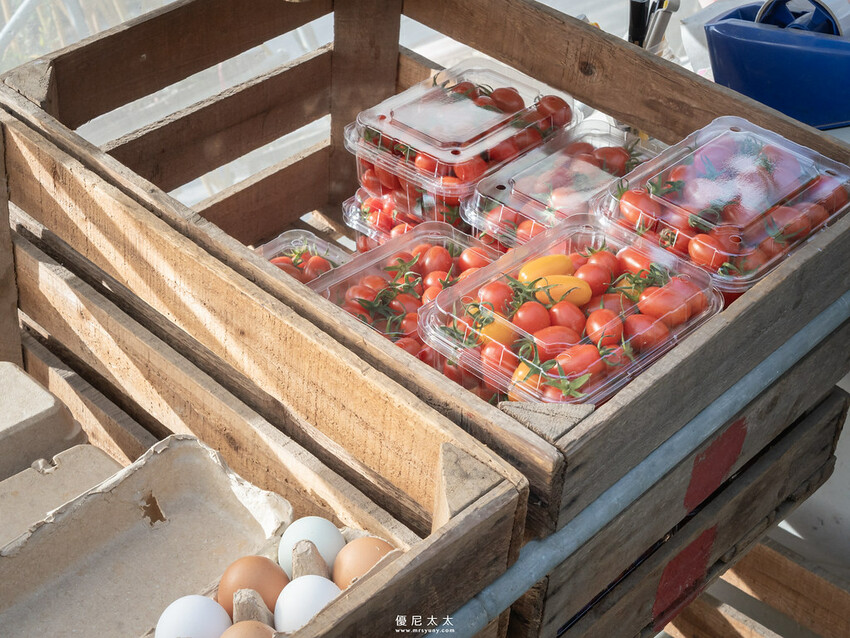 除了採果的樂趣,溫室內還提供各種新鮮的農產品,讓遊客可以購買回家,非常有趣的是,這裡販賣的雞蛋是各種品種的雞所組成,有紅有白,甚至有非常珍貴的烏骨雞雞蛋,老闆說,烏骨雞每天才下一顆雞蛋,營養成分十足呢!