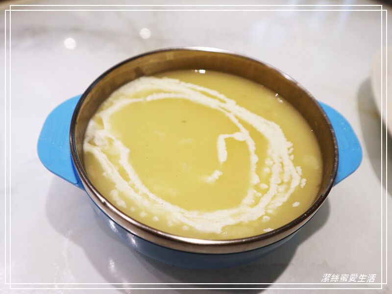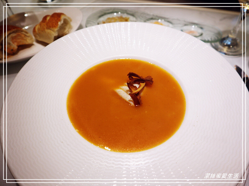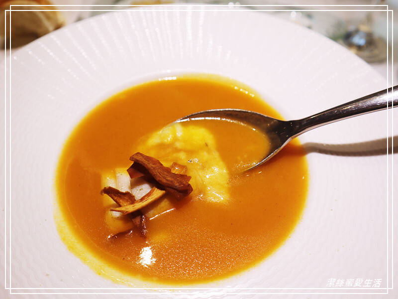 盤中已先盛裝馬鈴薯泥,再由服務人員直接加湯,湯頭是蕃茄及蔬菜為基底,馬鈴薯泥超柔滑綿密,和濃湯一起喝非常棒,這道我蠻喜歡的。