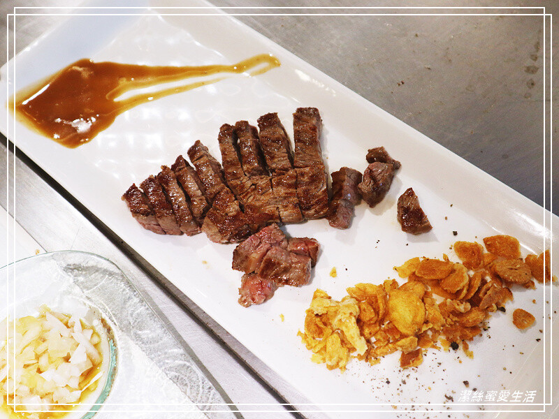 和牛牛排可搭配醬汁及蒜片一起用,口味部份個人覺得中規中矩而已😂😂,沒有特別驚豔,不過不知是否對它期望太高XD。