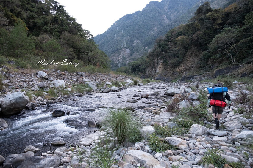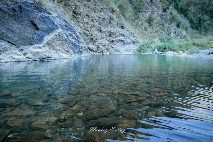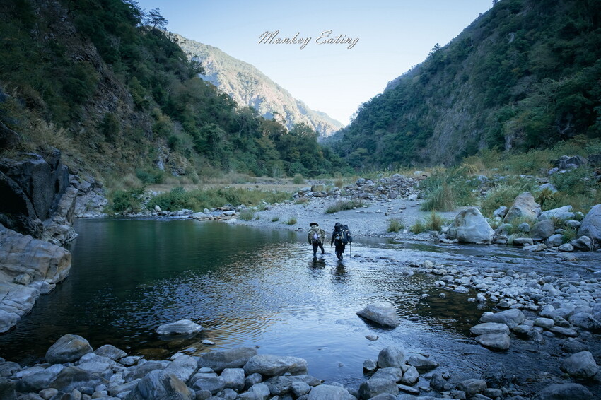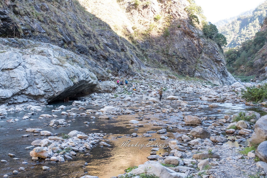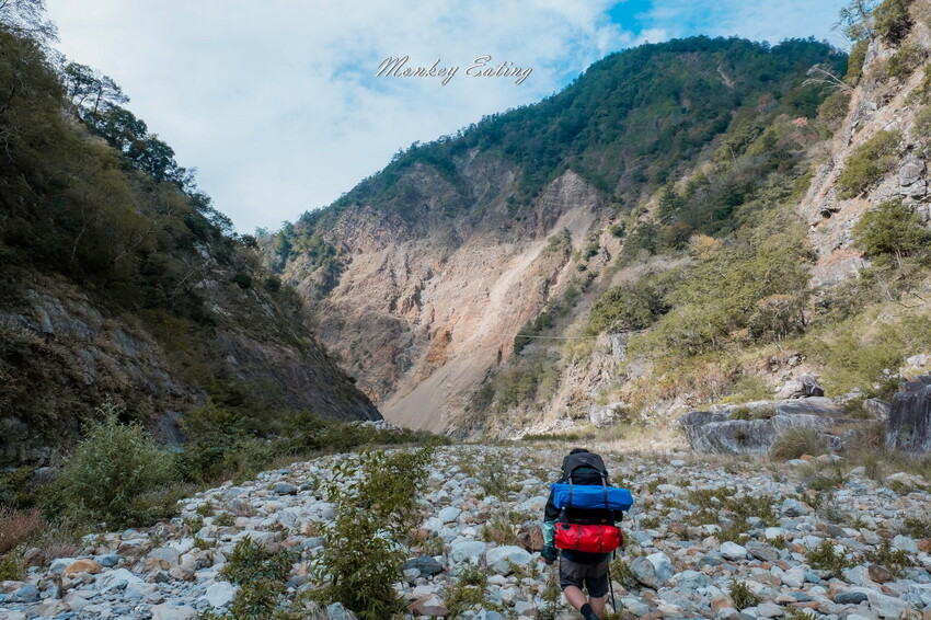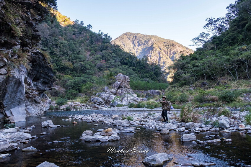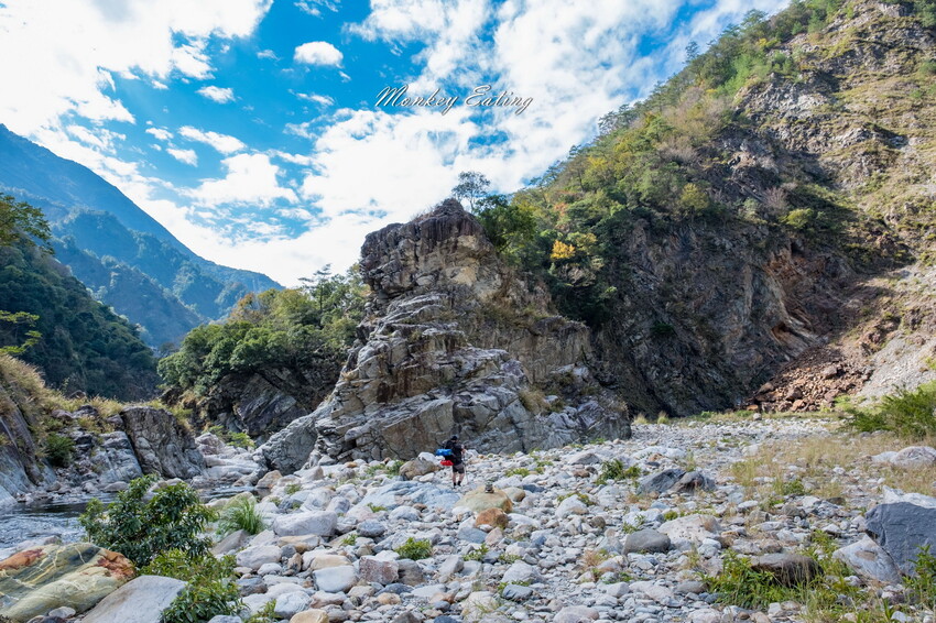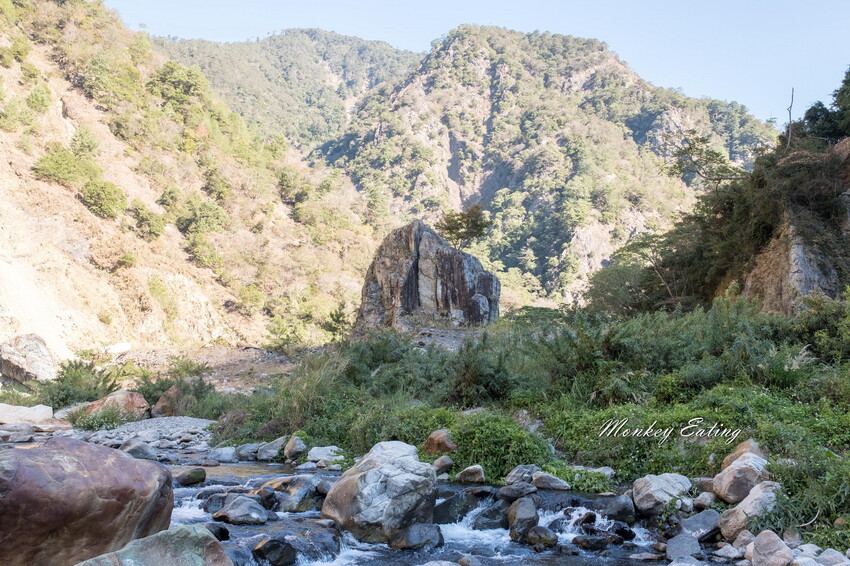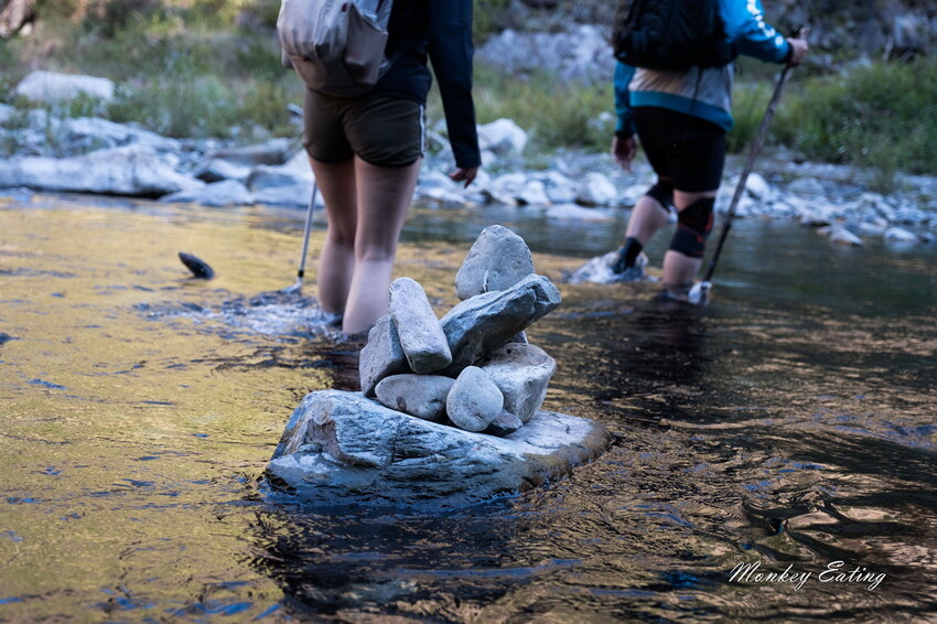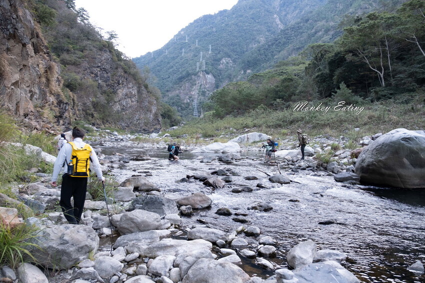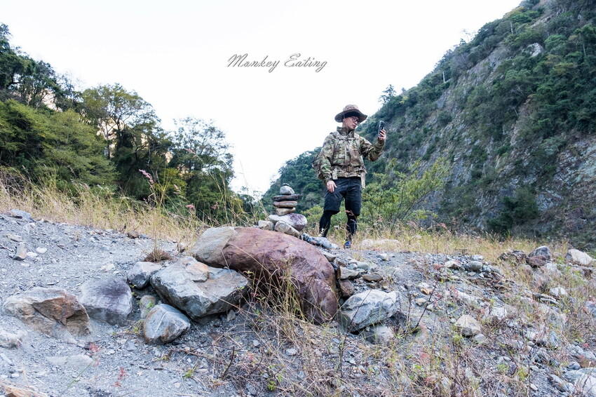 下切來到大甲溪,漂亮的V字型峽谷就在眼前,沿著河床邊往裡面走,沿途會看到堆疊的石頭,可以當作路線參考的座標。