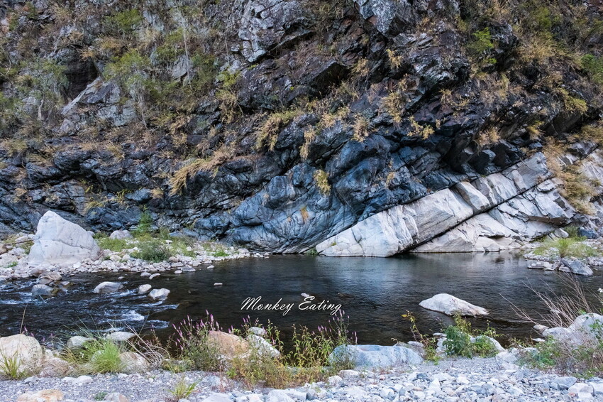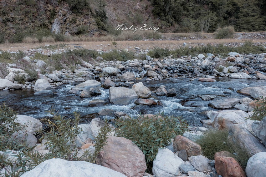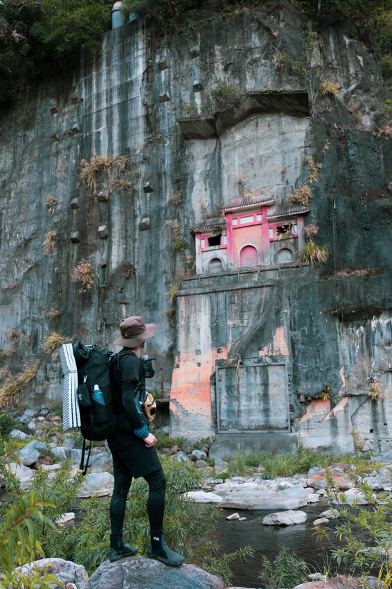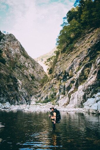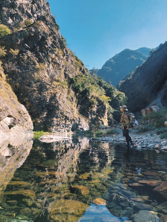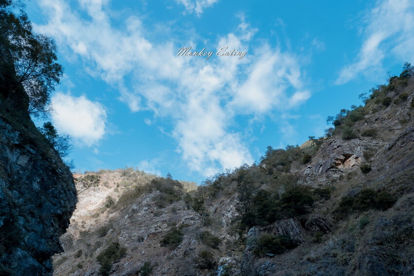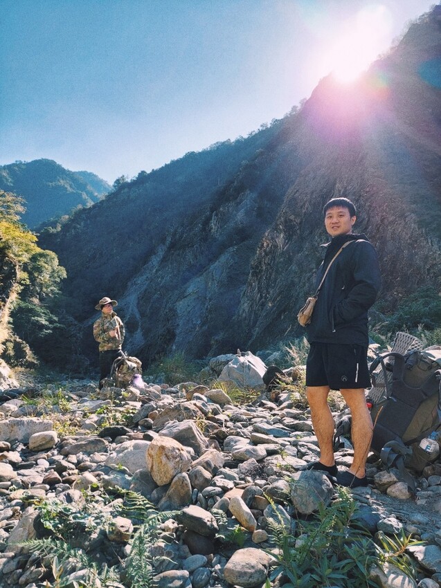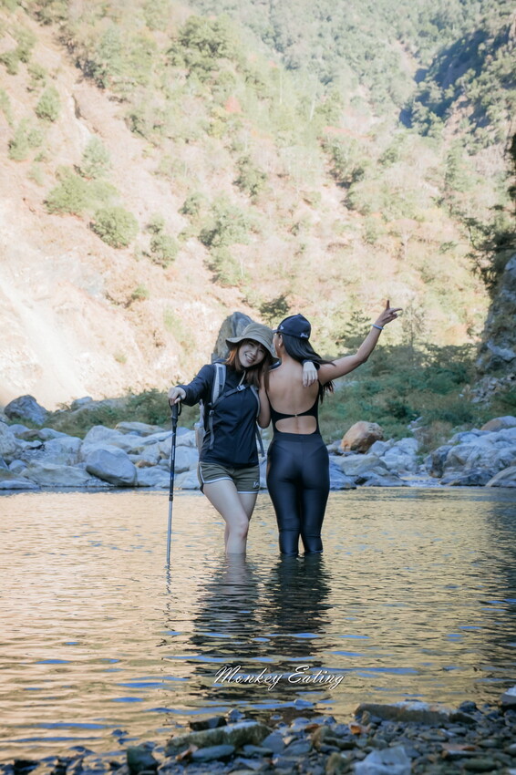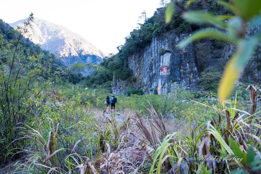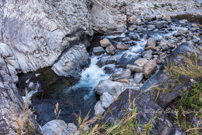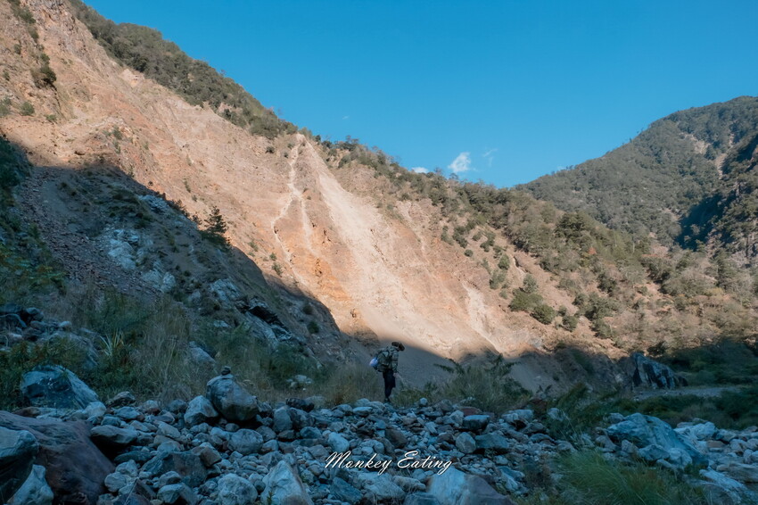 下切來到大甲溪,漂亮的V字型峽谷就在眼前,沿著河床邊往裡面走,沿途會看到堆疊的石頭,可以當作路線參考的座標。