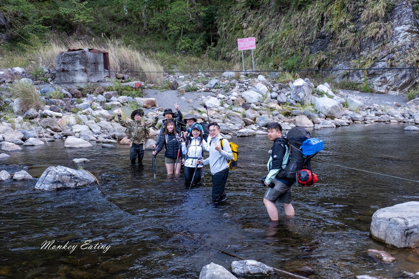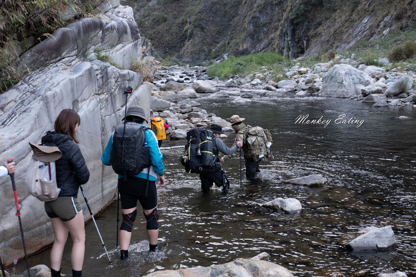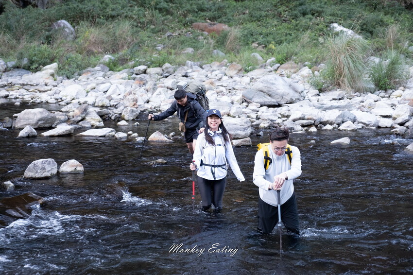過溪就自行找比較淺的地方過,先用登山杖探前面的路,再接著走下一步。