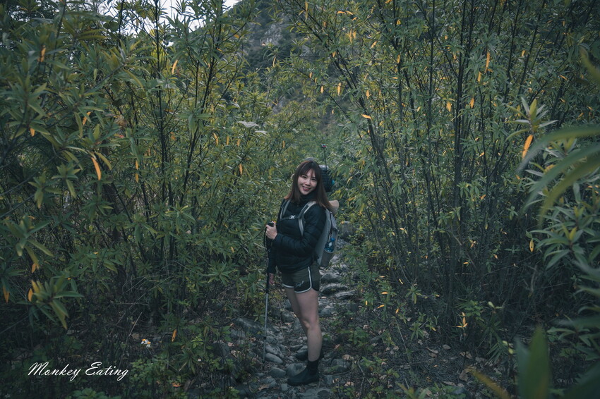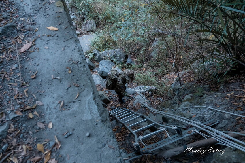 過了草叢抵達梯子這邊要下切到河床,簡易搭建的梯子一次一個人過,而且背重裝真的不好走,非常陡要注意安全。