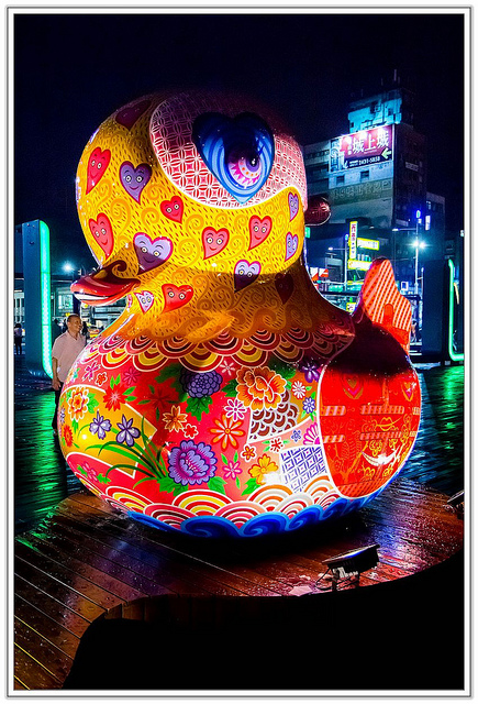 這兩隻鴛鴦以及周邊的動物彩繪裝置藝術都是出自台灣雕刻藝術家洪易的作品,