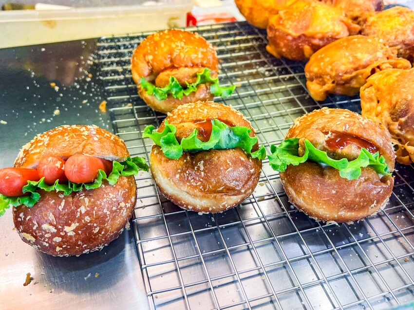 熱狗堡,這樣一個25元,裡面包了一根半的熱狗還有一些生菜跟沙拉醬,一開始想說外層是漢堡麵包,但它其實也是甜甜圈,吃起來很蓬鬆,外表還有些許的酥感,有點像基隆營養三明治的口感