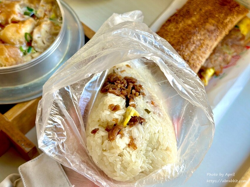 包的蛋是蔥蛋,這飯糰的糯米飯吃起來口感比較Q軟,裡頭包的料就是一般的傳統飯糰那樣,蔥蛋、菜脯、肉鬆、油條等,整體吃起來我覺得算不錯。如果喜歡吃比較偏軟Q的飯糰,可以吃這家的飯糰。