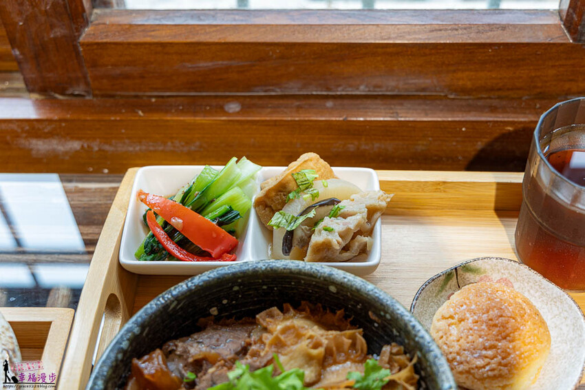 米飯上有著鹹豬肉、叉燒肉和馬告杏鮑菇香腸。