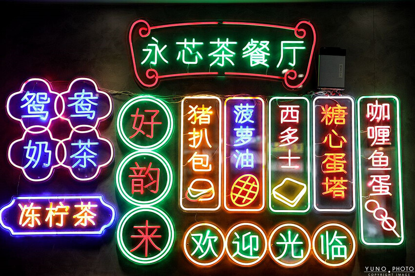 店內充滿霓虹燈、馬賽克磚、廣告看板、懷舊風情....等香港元素 都讓人彷彿置身在香港冰室