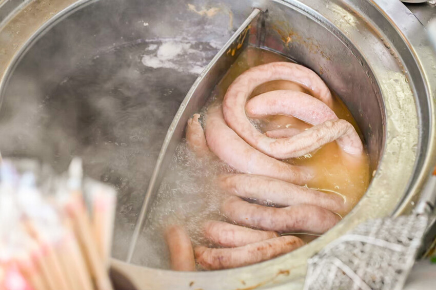 招牌五層大腸放在高湯裡煮,粉嫩的顏色看起來非常誘人,點了之後老闆才會從鍋裡撈出大腸,先把五層豬腸切段之後,進去高湯裡面燙約一分鐘,最後再放入碗中,加入乳白色的高湯,光看就是好吃樣!