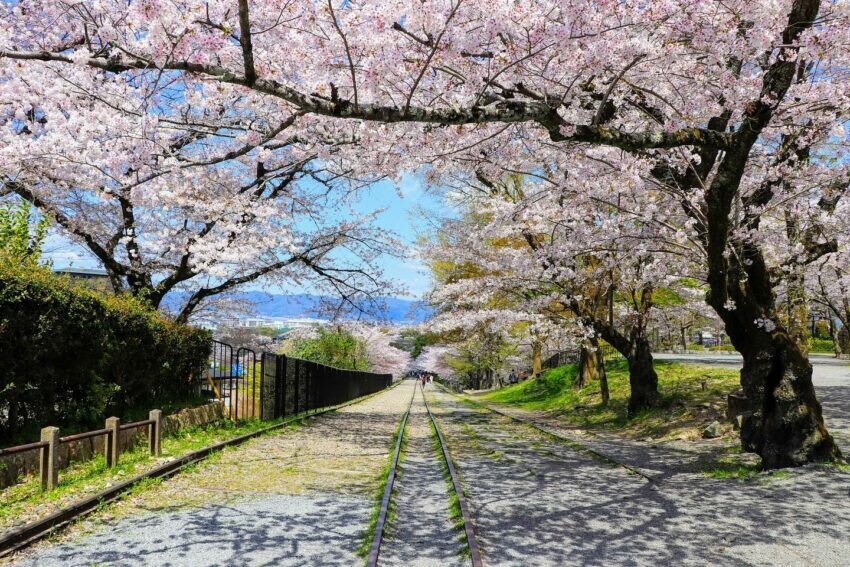 蹴上鐵道最早是做為輔佐疏水道運送物資使用,荒廢後因兩旁種滿茂盛繁密的日本櫻花吉野櫻成為免費賞櫻景點而爆紅,加上前往這個京都櫻花景點的交通方式便利,如果要拍到沒有人的空景,真的需要提早抵達,否則白天遊客如織,拍照很難避開人群。建議拍照角度是拍下荒廢的舊鐵道與兩旁盛開的京都櫻花相互輝映的畫面,鐵道在照片中彷彿無限延伸看不到盡頭,有種靜謐、遺世獨立的美感。