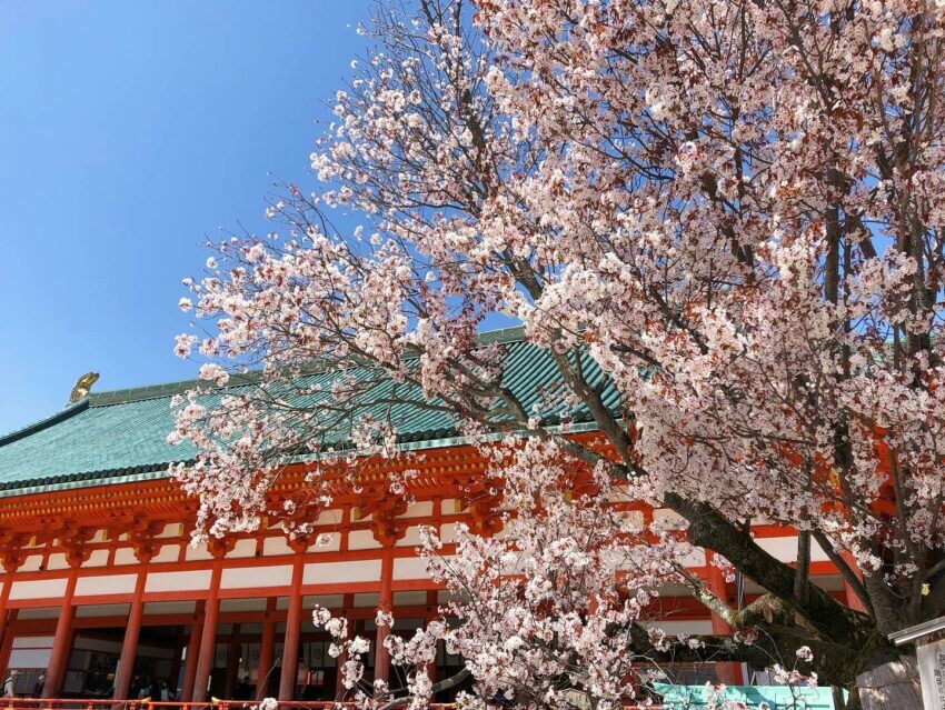 京都充滿百年歷史古蹟,但相較其他寺院,平安神宮顯得又新又大,典雅氣派。平安神宮是為了紀念平安時代遷都1100周年所創建,當時建造時周遭也栽種不少日本櫻花,四月初京都櫻花季來臨時,可以拍下正紅色神宮建築、華麗庭院與粉紅色枝垂櫻相映的美景,鄰近的岡崎疏水圳道,河岸兩旁盛開的櫻花,搭上遊船十石舟也別有一番風味,吸引不少日本與外國遊客前來京都賞櫻花。