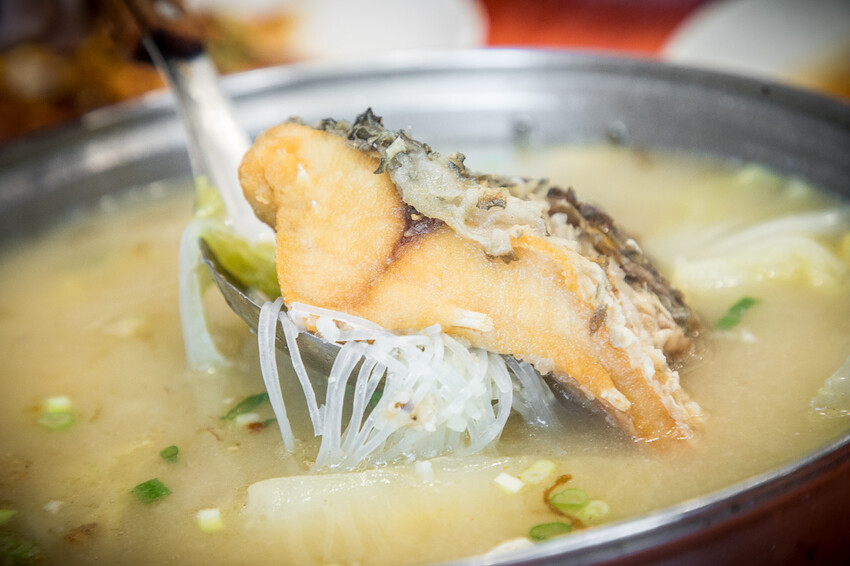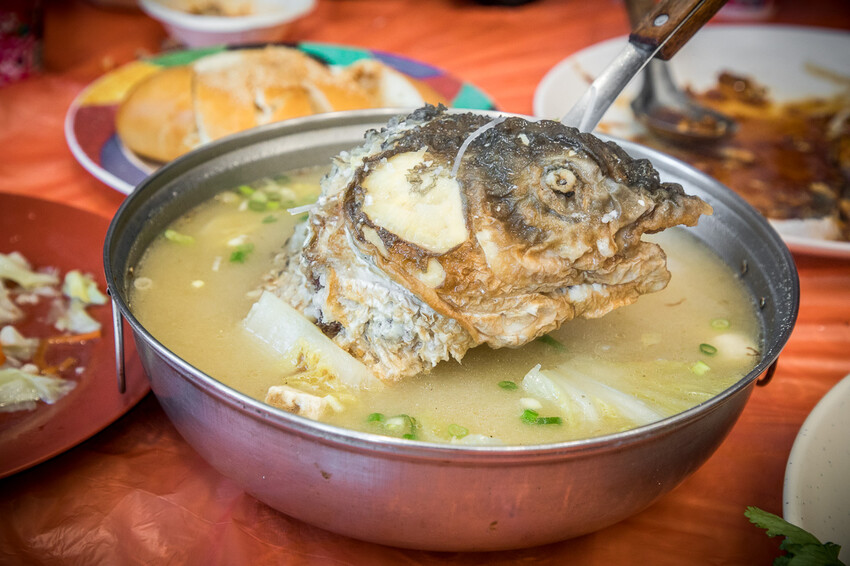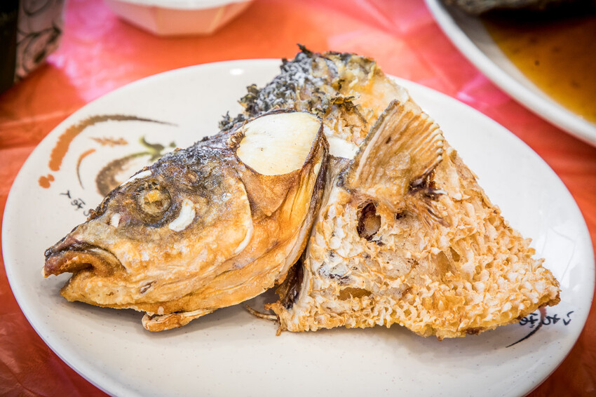 砂鍋魚頭湯,因為我們整個魚頭下去煮會吃不完,店家特別將另一半魚頭保留,我們吃不完打包回家可以再放進去煮,一上桌就可以聞到濃郁的香氣,魚頭相當碩大,先炸後煮,肉質吸飽的湯汁的精華,冷冷冬天來上一鍋絕對享受!