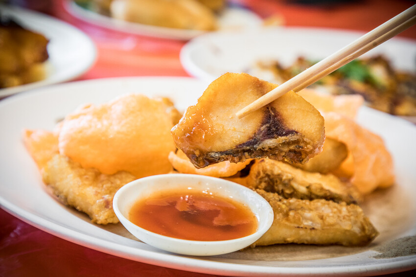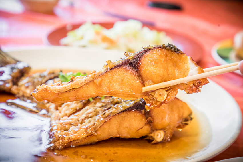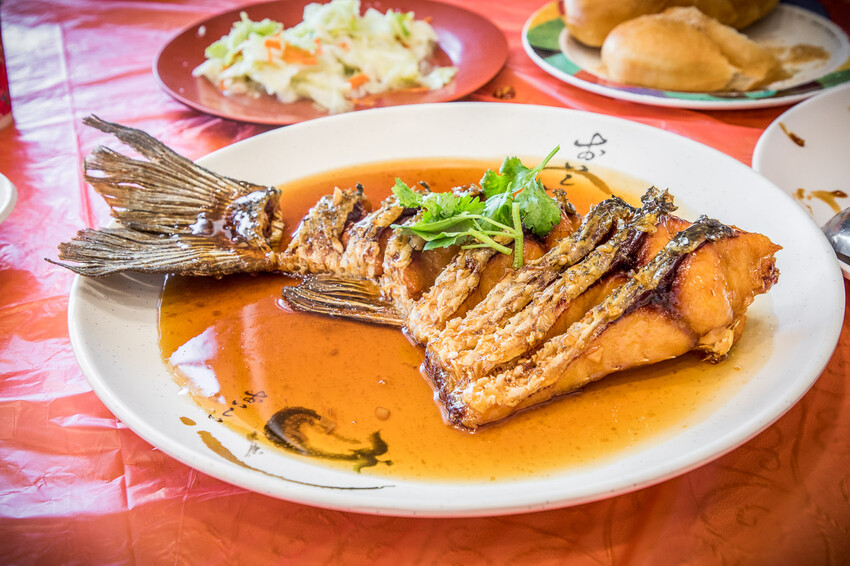 炸魚塊,這個也很好吃,魚塊外面裹上薄粉油炸,吃起來外酥內嫩,然後刺也不多,沾胡椒或是沾類似泰式的酸甜醬汁都很好吃