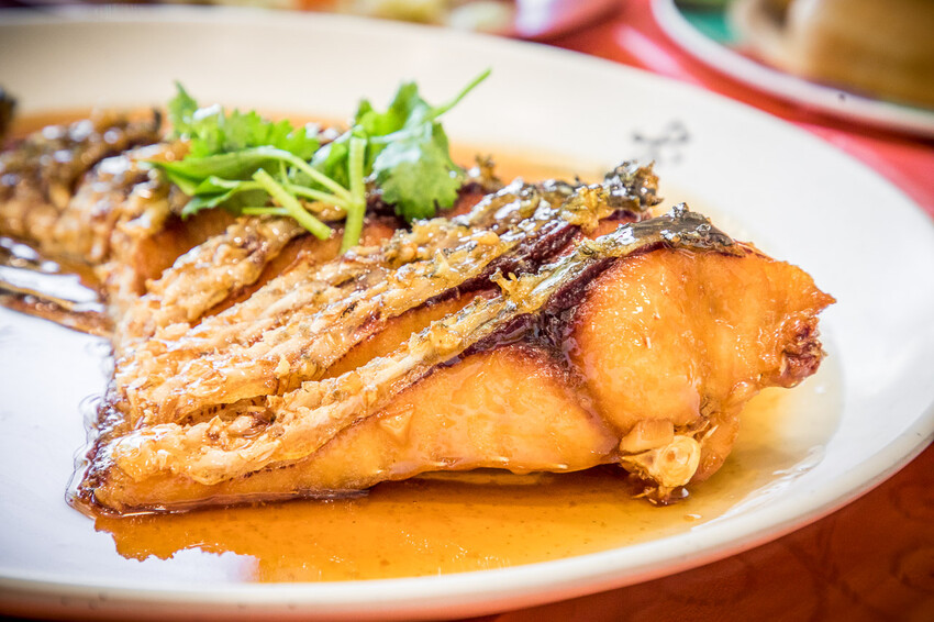 糖醋魚,是用魚的尾巴去料理,肉質很豐滿,一般是活魚料理是像松鼠魚的呈現方式,今天我們選的魚比較小,就直接切厚片處理,吃起來真的肉感十足!淋上酸酸甜甜的糖醋醬,魚肉軟嫩配上濃稠的糖醋醬,甜甜酸酸,魚皮脆脆酥酥的口感超迷人