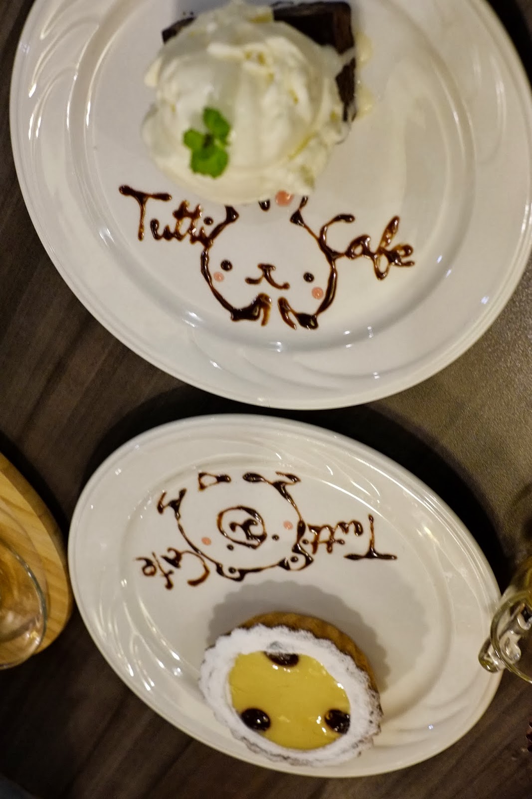 甜點 酒漬櫻桃烤布蕾塔與tutti經典布朗尼佐香草冰淇淋,連盤子都有作文章,一個畫熊一個畫兔子。