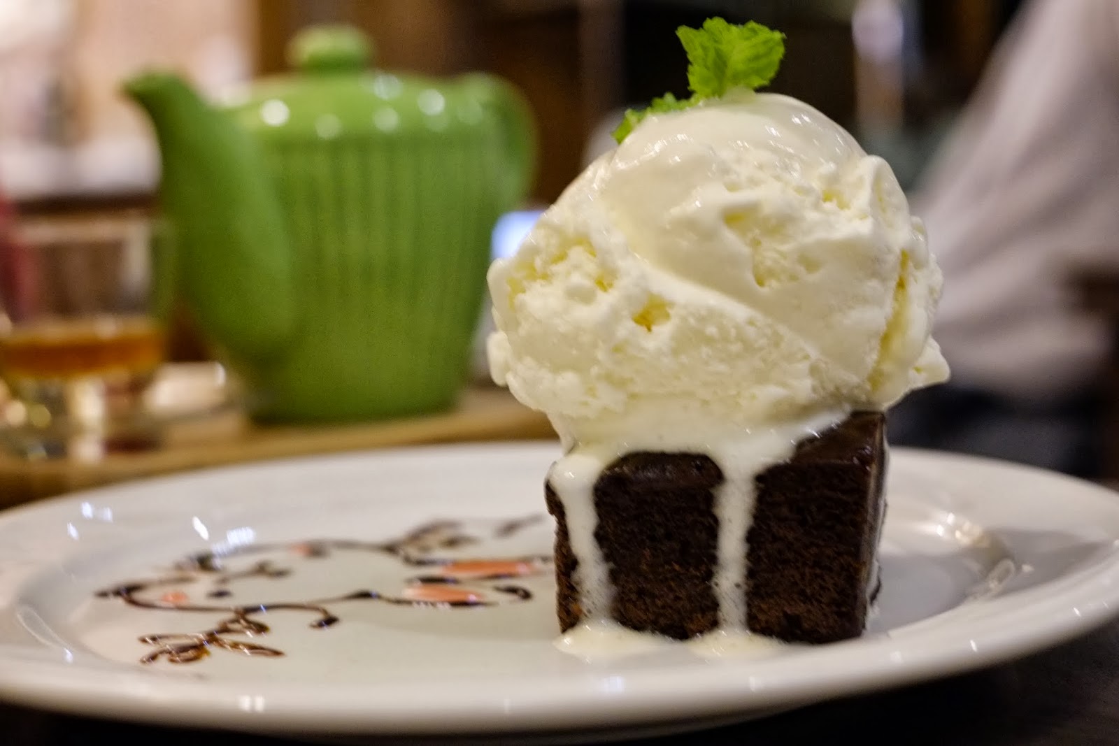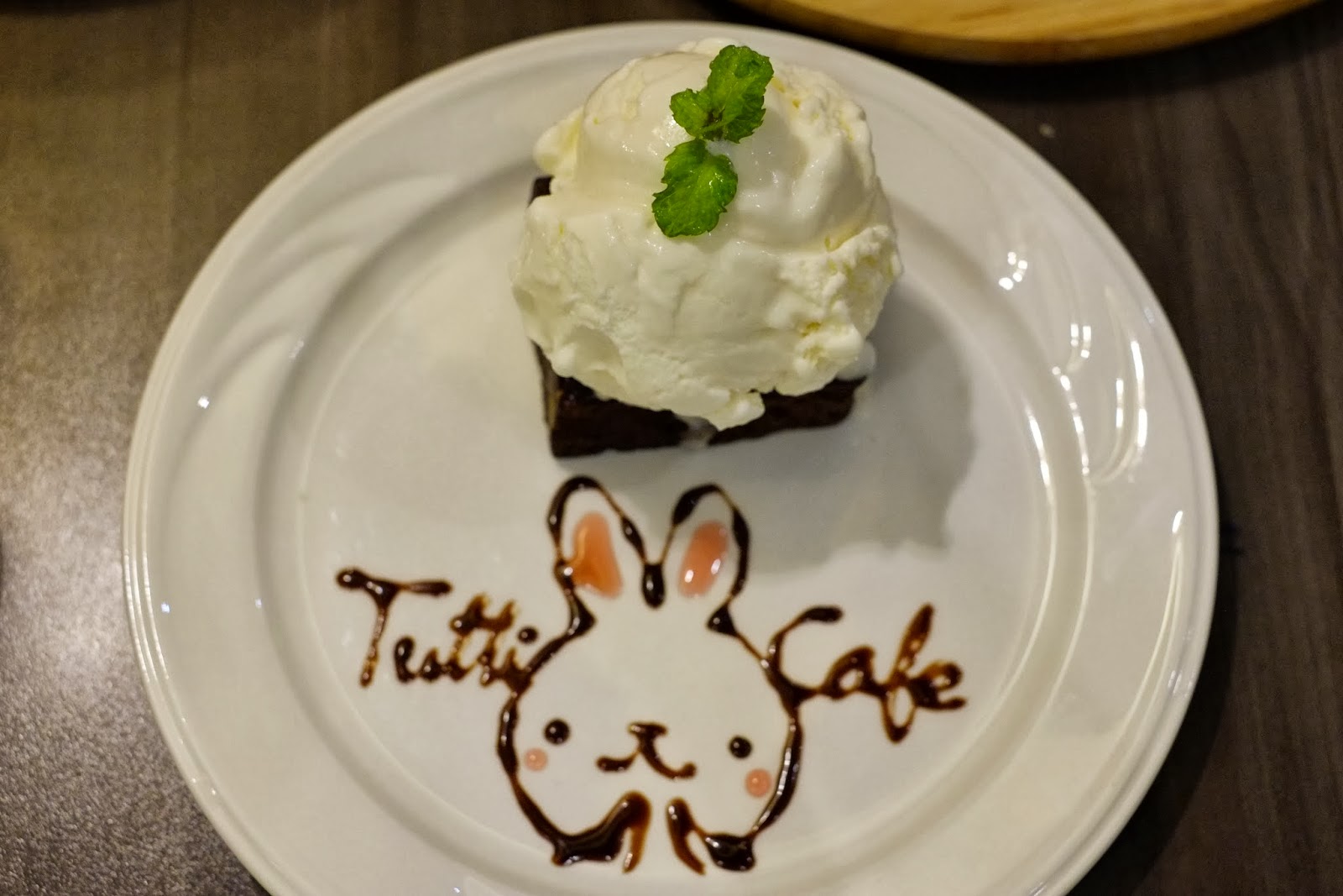 布朗尼上除了無敵大球香草冰淇淋,還有香草葉,兔子的造型很吸引人的目光,香草冰淇淋,加上熱熱的布朗尼巧克力,裡面包著一些核桃,布朗尼沒有想像中的甜,冰火交疊很好吃。