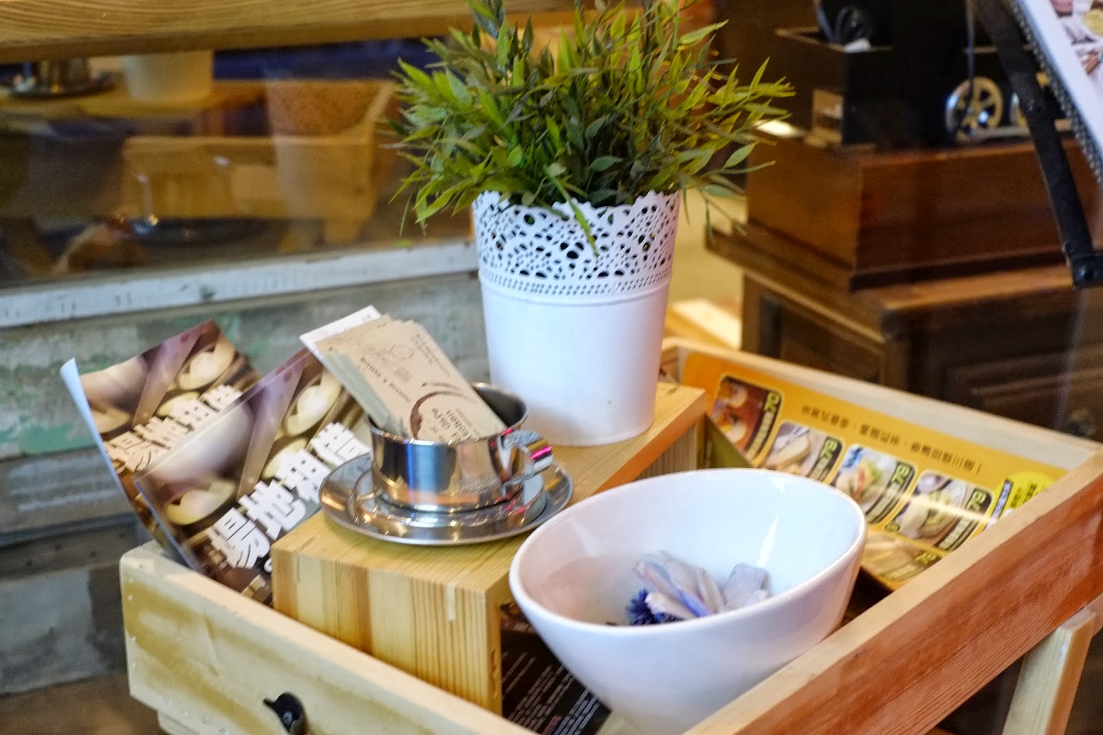 黑板寫著招牌特色跟櫃台,其他都有著小物擺設,很適合挖掘看看有無新玩意還有一台烘豆機。