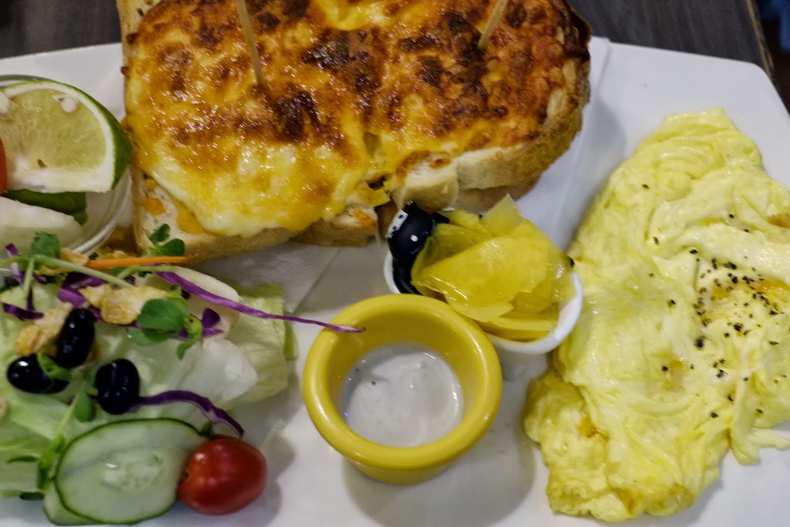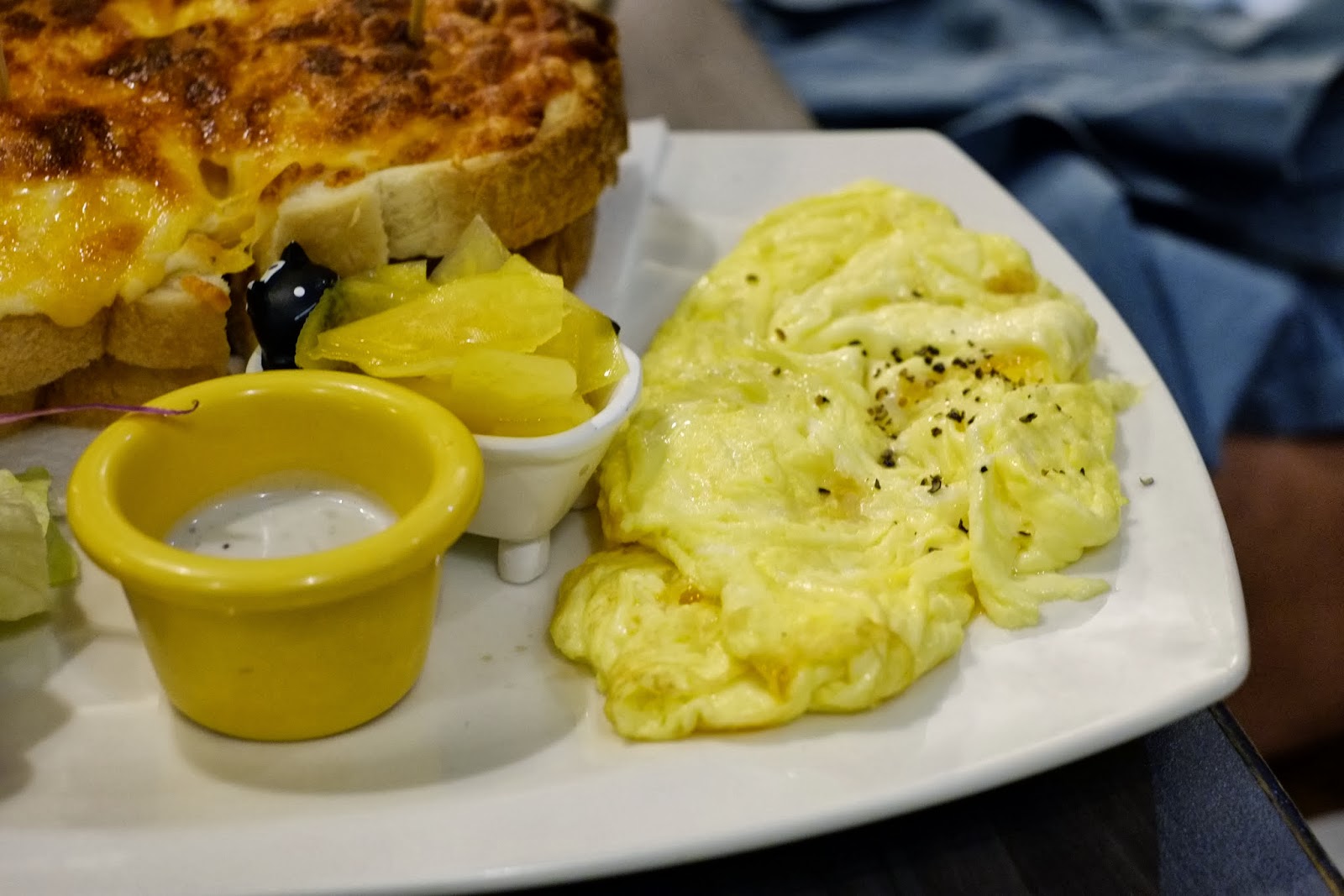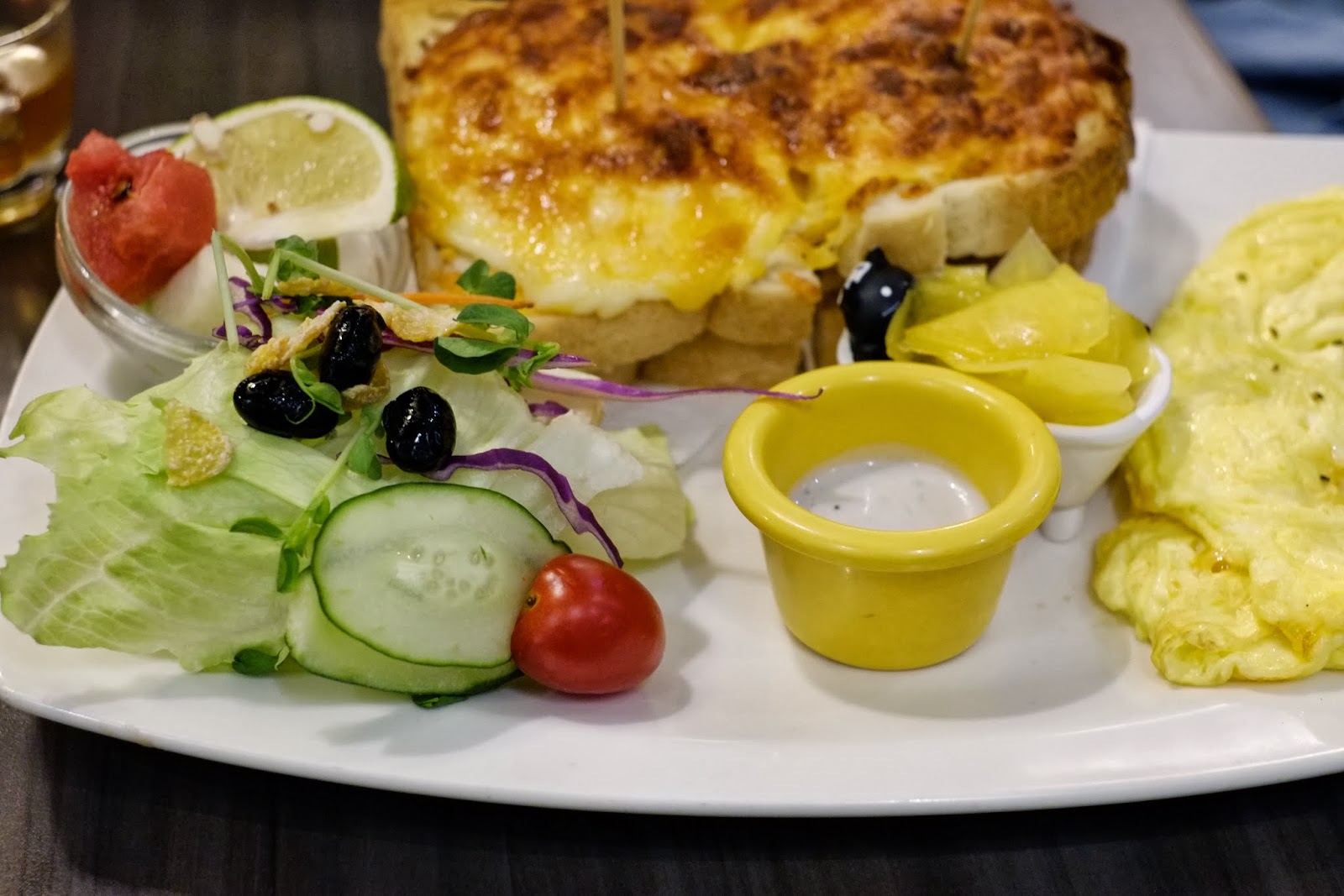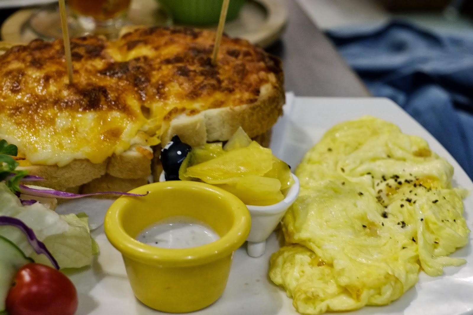 焗烤核桃鮪魚英式土司,配菜與上面是一樣,但是薯條換成了歐姆蛋,看不到內在情況下就是焗烤土司厚片,貼心的已經切好,方便食用,裡面包著滿滿的鮪魚跟核桃還有蘋果片,加上碎洋蔥跟醬搭配的宜,爽口不膩,而且鮪魚包的非常紮實,最上層的起司與土司將其包圍,好吃!歐姆蛋包著起司,簡單的美味。