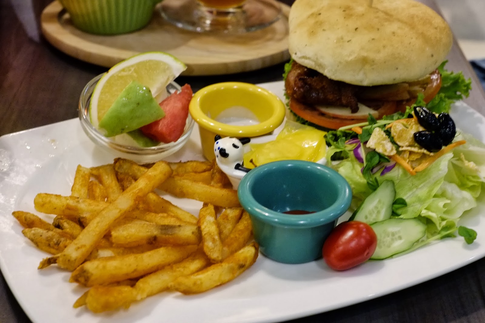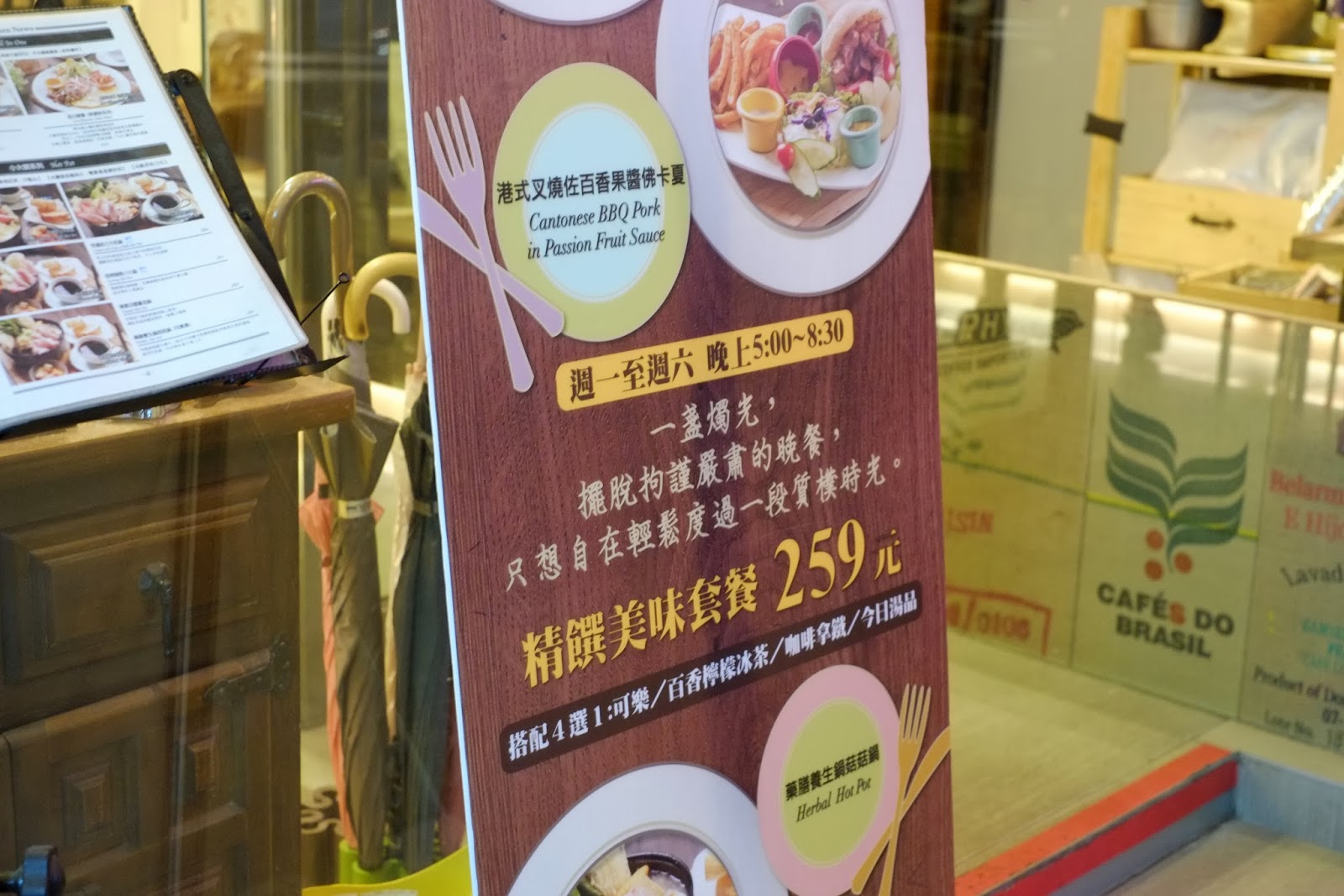 港式叉燒佐百香果醬端上來賣相很不錯,有水果、沙拉、薯條、百香果青木瓜跟主餐用的是佛卡夏麵包。沾醬有著百香果香的味道,酸酸甜甜,水果是芭樂、西瓜跟柳丁。百香果青木瓜很像蜜餞甜甜的,搭配會讓人會心一笑的小物上來也挺有趣。