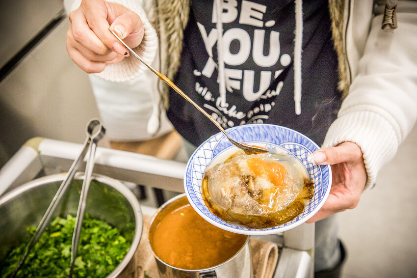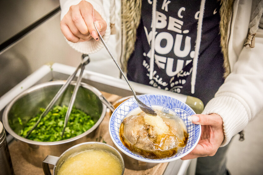 內用肉圓起鍋後,老闆娘會先把肉圓剪開再淋上基礎醬料,然後端到裡面後再自己去醬料區看要加辣、加蒜、加香菜等就自己去加