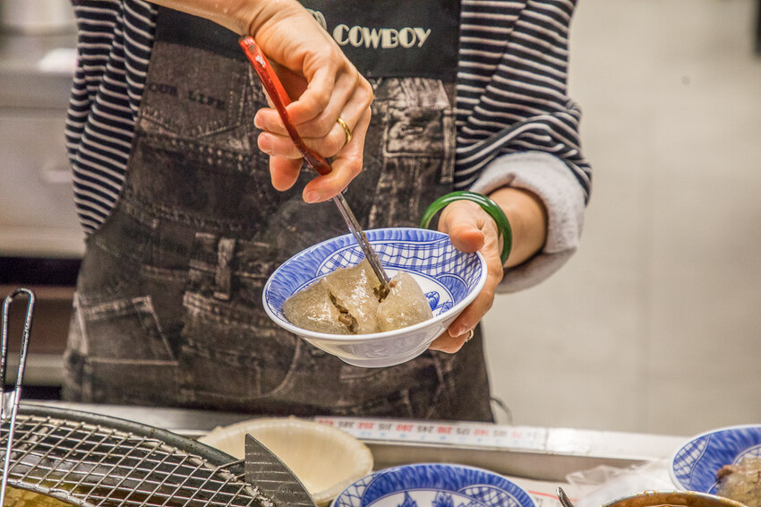 萬粒肉圓就是道地彰化肉圓的做法,是用低溫油泡的方式,油真的很清澈,然後老闆娘邊炸還會邊擠油,起鍋再放到旁邊瀝油再裝碗