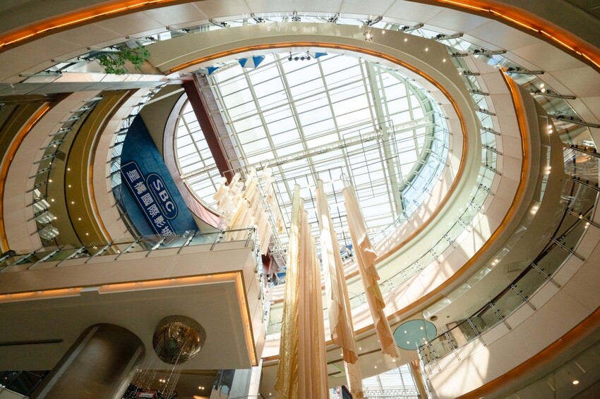 金黃的瀑布從購物中心頂樓向下延伸,代表著滿滿的黃金錢財往身上湧入,富貴招財的好兆頭。