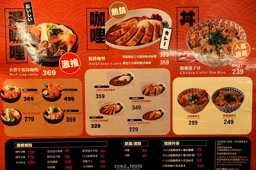禾荳家菜單品項大致上分為湯咖哩、熟成咖哩、丼飯定食三大類