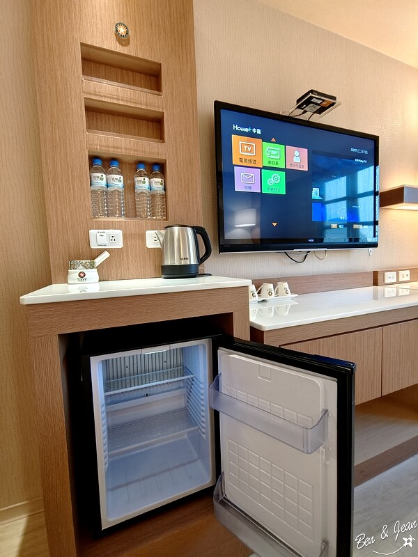 櫃子這部份的空間利用也很棒, 茶包、 咖啡包、礦泉水、煮水壺,下面則是冰箱
