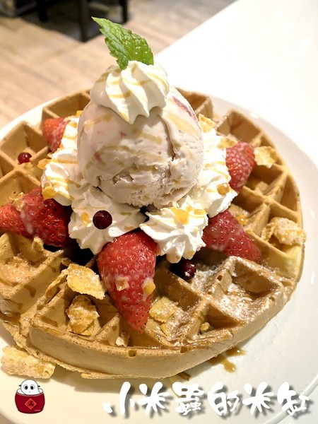 鬆餅上擺了鮮紅欲滴的草莓、滿滿的鮮奶油、冰淇淋、玉米片