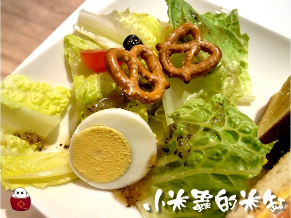不但有鮮脆的生菜,還有水煮蛋跟帶有蒜味的蝴蝶餅乾