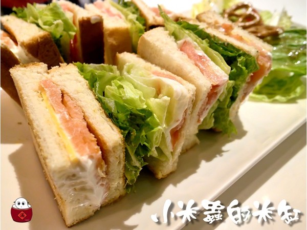 三明治則是將烤好的吐司夾進了滿滿的生菜、起司、番茄還有燻鮭魚