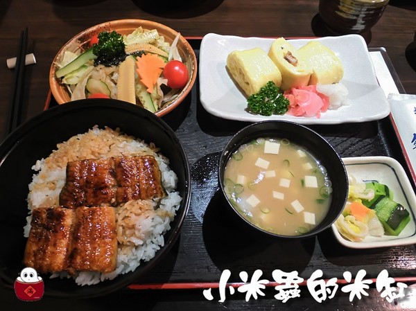 鰻魚飯、生菜沙拉、鰻魚蛋捲、味噌湯、醃漬物