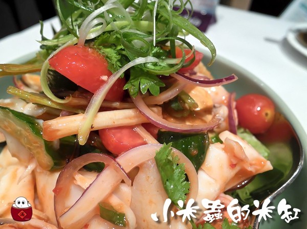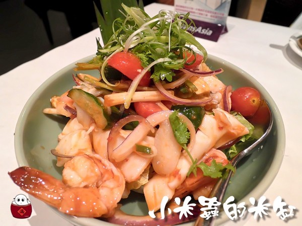 涼拌海鮮裡面有草蝦、花枝、蟹肉、淡菜和晶湯匙主廚特調的獨家醬料一起涼拌