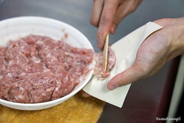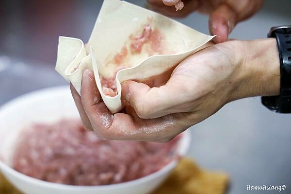 拿著手掌大的餛飩皮,擺上黃金比例的特製豬肉餡,