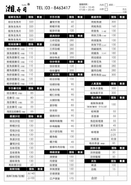 菜單,主要分有生魚片、握壽司、沙拉、烤物、手捲、熱炒、人氣炒飯、湯品、蓋飯…等