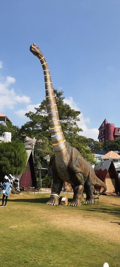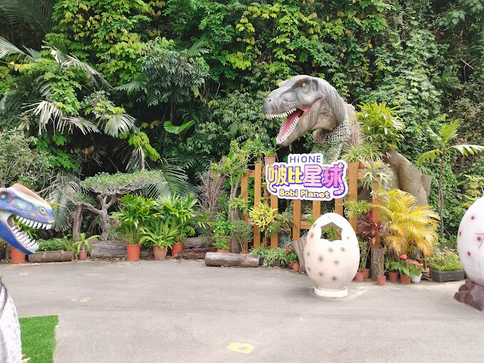 終於走到對岸的園區了,迎接大家的就是這隻比長頸鹿還高的雷龍🦕,這隻恐龍還會搖頭擺尾,超級逼真喔!勇敢一點的遊客還能騎上去,拍幾張英勇的照片也不錯