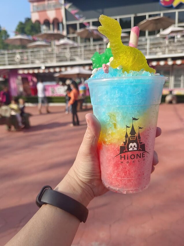 由於天氣炎熱,我也忍不住去買了一杯彩虹恐龍冰來消消暑🍧,五顏六色的冰沙上面還擺了二隻恐龍,另外再點綴一支脆笛酥和幾顆軟糖,這麼搶眼的恐龍冰大人小孩都愛,不買來嘗鮮怎麼可以?