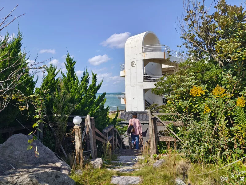 沿著樹林裏的階梯,緩步往下走就會抵達餐廳的入口了