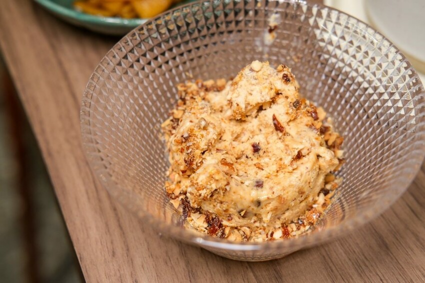 ▼它們家的甜點絕對不能錯過,老闆娘擁有法式甜點的烘焙背景,完勝外面許多甜點店的水準,首推看起來很神秘的半凍冰糕,其實是傳統的義大利經典冰淇淋,灑上香烤過的焦糖堅果碎,略帶黏性的口感中,能吃到鹹脆的鹽之花鹹顆粒,每一口都帶來豐富的層次變化。