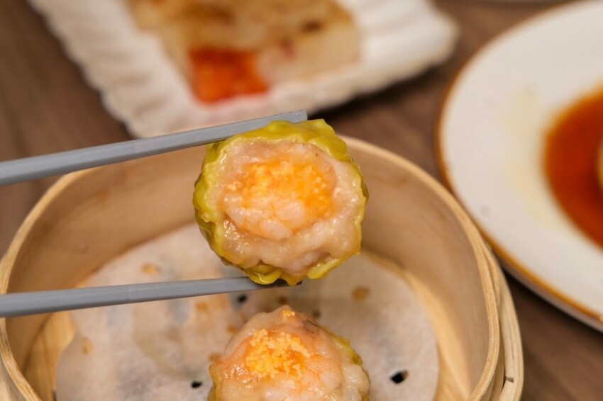 ▼以純手工包製的鮮蝦魚子燒賣,頂頭擺著整尾的鮮蝦,咬起來比外面得更Q彈紮實,滿滿鮮味在口中炸開!