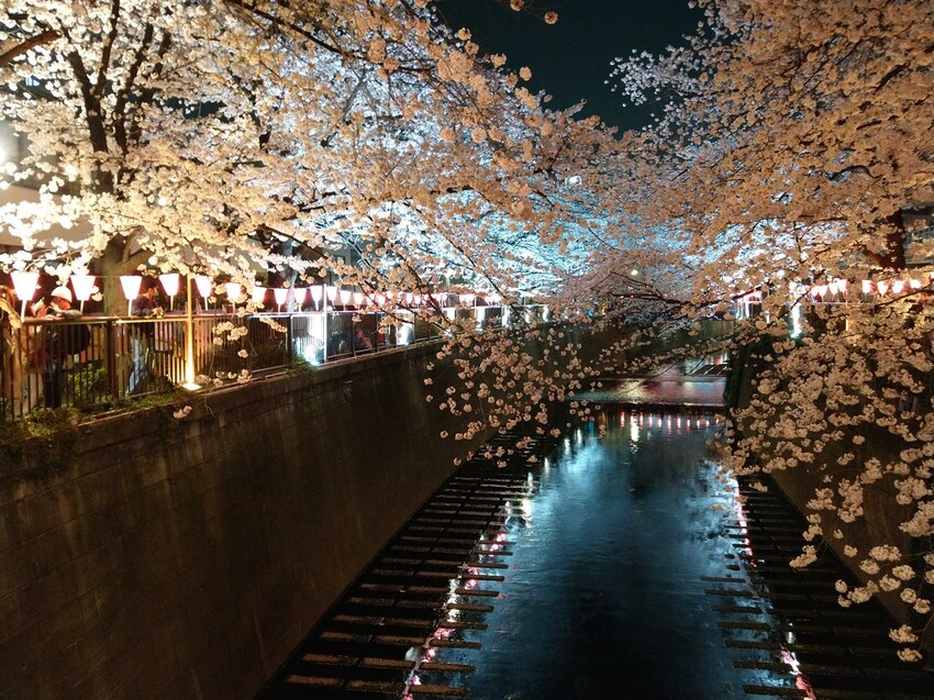 從「中目黒站」徒步約5分鐘就可以走到「目黑川」,目黑川兩旁種滿了約800棵以上的吉野櫻櫻花樹,在櫻花季時便會形成一條長約4公里的櫻花步道,晚上的燈光照射與目黑川倒影更增添了夜櫻的唯美氛圍。