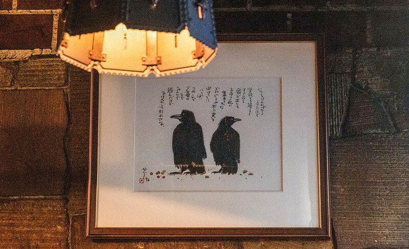 カラス是烏鴉的意思,牆上也應景的放了一幅寫了有關「烏鴉」歌謠的畫作。之所以會取「ガラス」是因為店主的父親,喜歡有關「ヤタガラス」這個八咫烏神話故事有關。ps:鳥鴉在日本神話中有「神使」的形象。