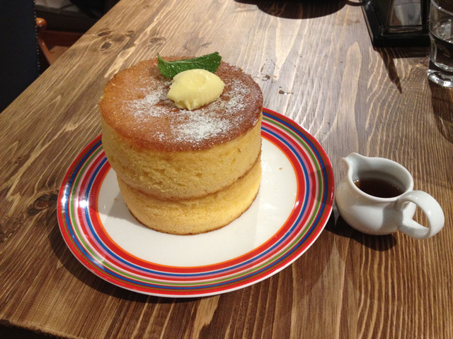 比起平常常見的鬆餅,這裡的主打是pancake類的薄煎餅,還有一款台灣限定的「舒芙蕾厚鬆餅」。單層和雙層只差$30,當然要點雙層。雖然菜單上說要等約20分鐘,不過因為人尚未很多,實際上等不到15分鐘就上菜了。