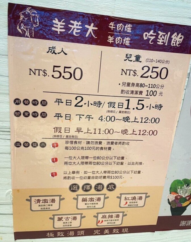 羊老大吃到飽(牛/羊肉爐-過嶺店)是採吃到飽用餐模式,用餐時間平日120分鐘、假日90分鐘,成人每人550元,兒童每人250元,除了內用外,也有提供外帶的單點菜單,比較下來認真覺得來店吃到飽真的比較划算!週六日中午沒有休息,下午臨時想到隨時來吃都有呢