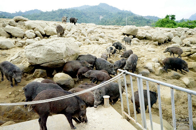 原本是野放的山豬,後來船隻不定時的餵養!! 不知從何時開始,船家播放”公主徹夜未眠”的歌劇,後來聽到音樂,就紛紛踏上這個平台來吃飼料了,很有趣吧