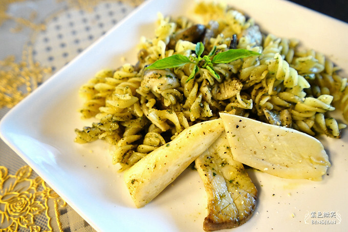 香樁口味的義大利麵! 搭配一旁的杏鮑菇! 這道大家吃的也是心滿意足啊