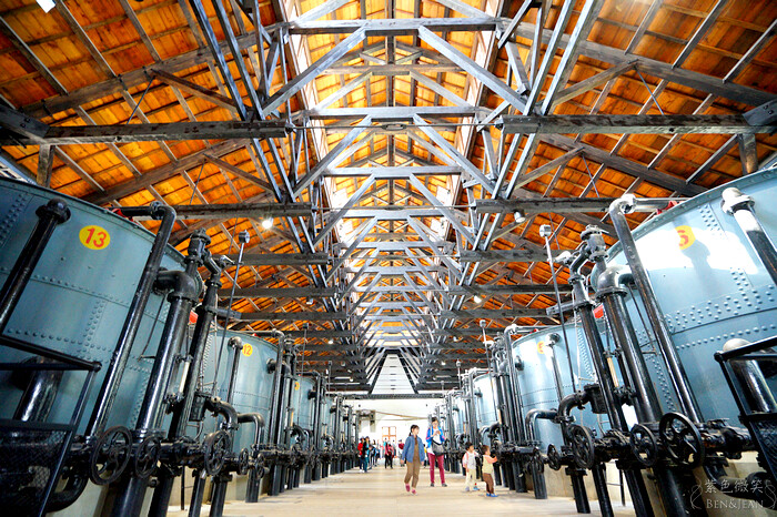 臺南山上花園水道博物館整排的大濾水筒與上方的屋頂鐵架,形成良好的對稱,標準的工業風,所以也是IG熱門打卡拍攝點啊