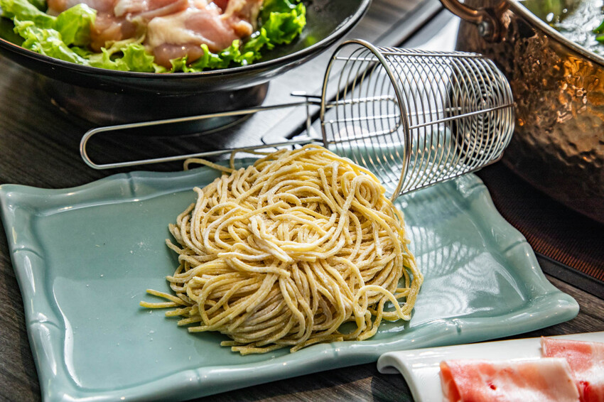 手感拉麵,這個拉麵超好吃!建議一定要煮青麻椒肥牛鍋,隨餐有附上一個小麵勺,把麵放進去煮就不怕撈不到,拉麵吃起來非常有彈性,而且細麵也很容易吸附湯汁,超級好吃!