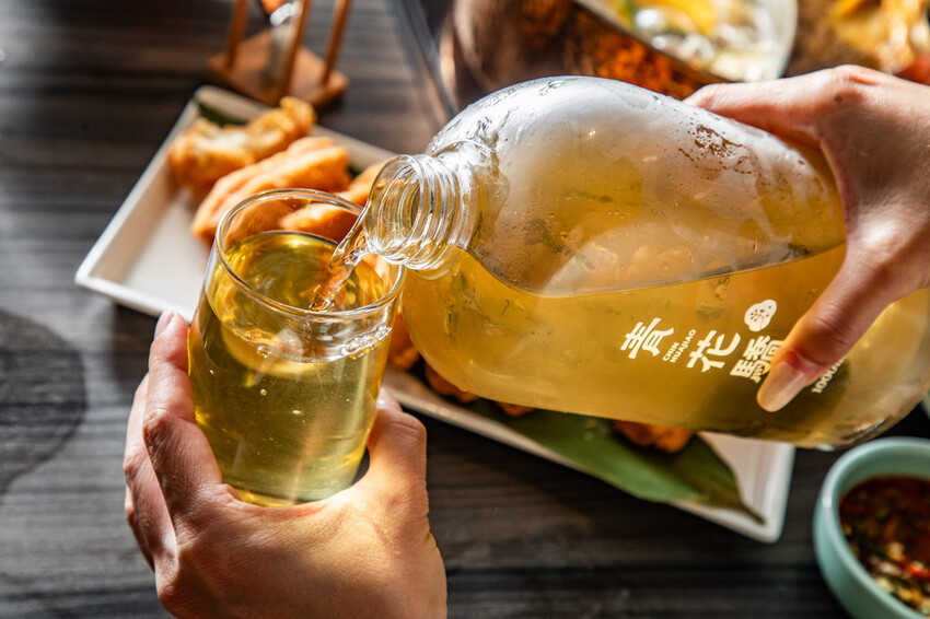 冰鎮青花烏龍,以台灣輕發酵茶葉和水蜜桃調製,加入青花椒增添風味,茶香清淡,尾韻帶有白桃的甜味,既清新又解辣