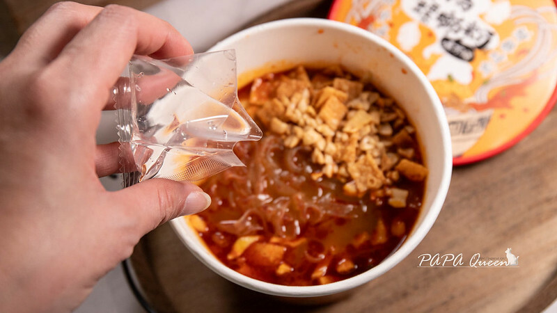 熱水注入…6分鐘後掀開,首先聞到的就是酸酸竹筍香氣,湯頭顏色則是呈現類似麻辣湯頭的色澤,馬上加入醋包,攪拌一下開吃。